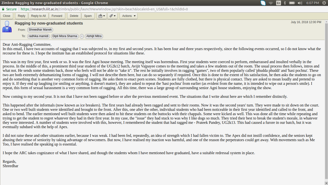 While the IIT-B student’s case was glaring because of the physical nature of his actions, sexual abuse need not be physical. First years in IIIT are routinely subject to sexual abuse often not physically involving the perpetrators.