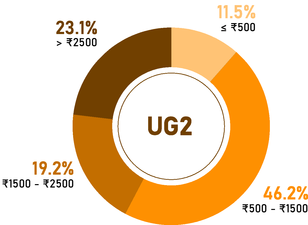 What would you assume was the thing that most people on campus spend their money on? Food seems like the most appropriate answer. However, how exactly is this distributed amongst eating out, canteens, leisurely activities, going out, etc? Do most people end up spending their money at JC or BBC? Or do they spend more on ordering out? A surprising(?) revelation was that around 60% of the students spend between 500 and 2500 rupees a month ordering out for food.